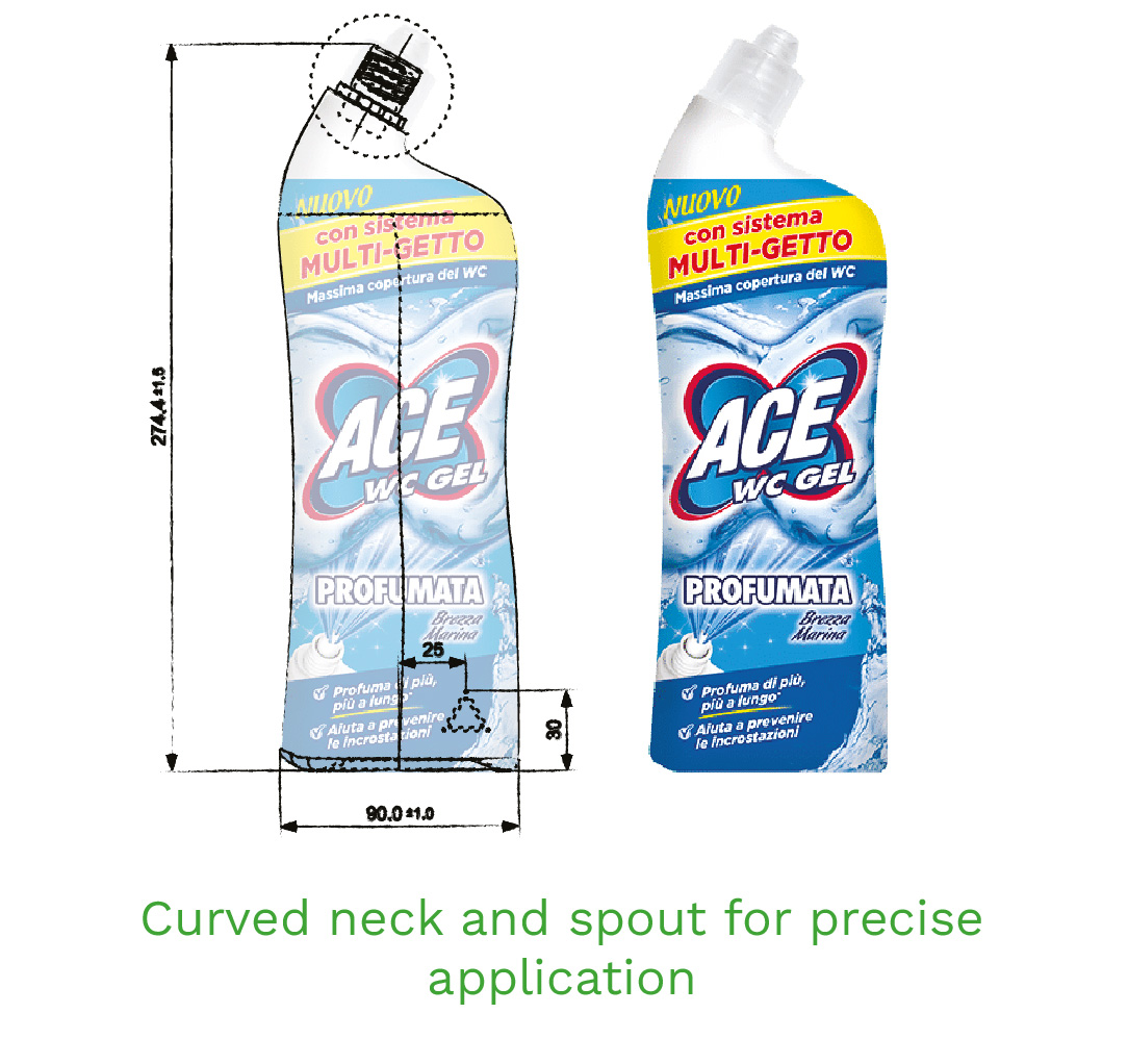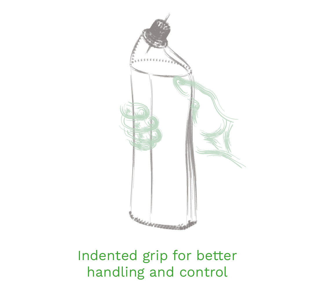 The goal is to design a functional and ergonomic bottle for ACE WC Gel that enhances the user experience while visually standing out on retail shelves. The shape of the bottle must combine aesthetics with practicality, ensuring ease of use, especially for targeting hard-to-reach areas.