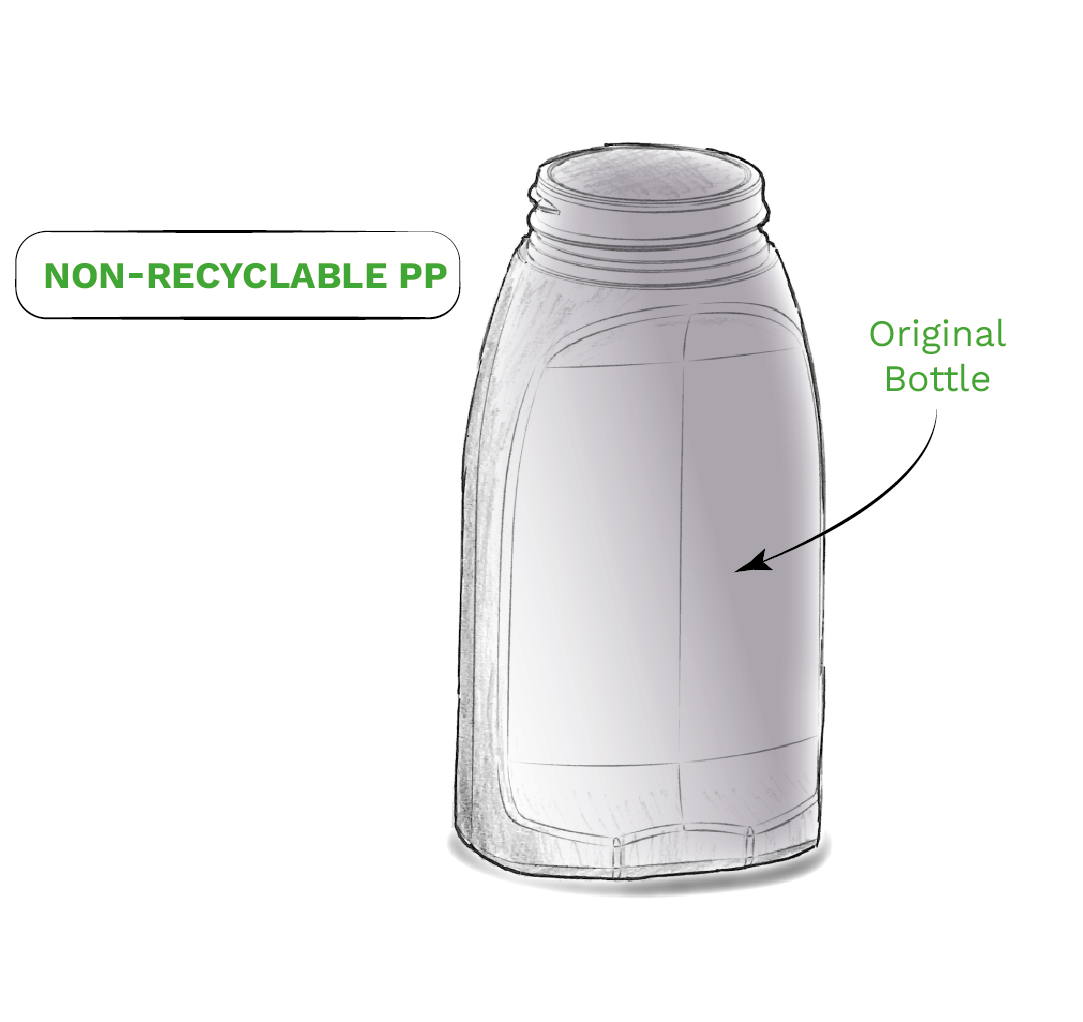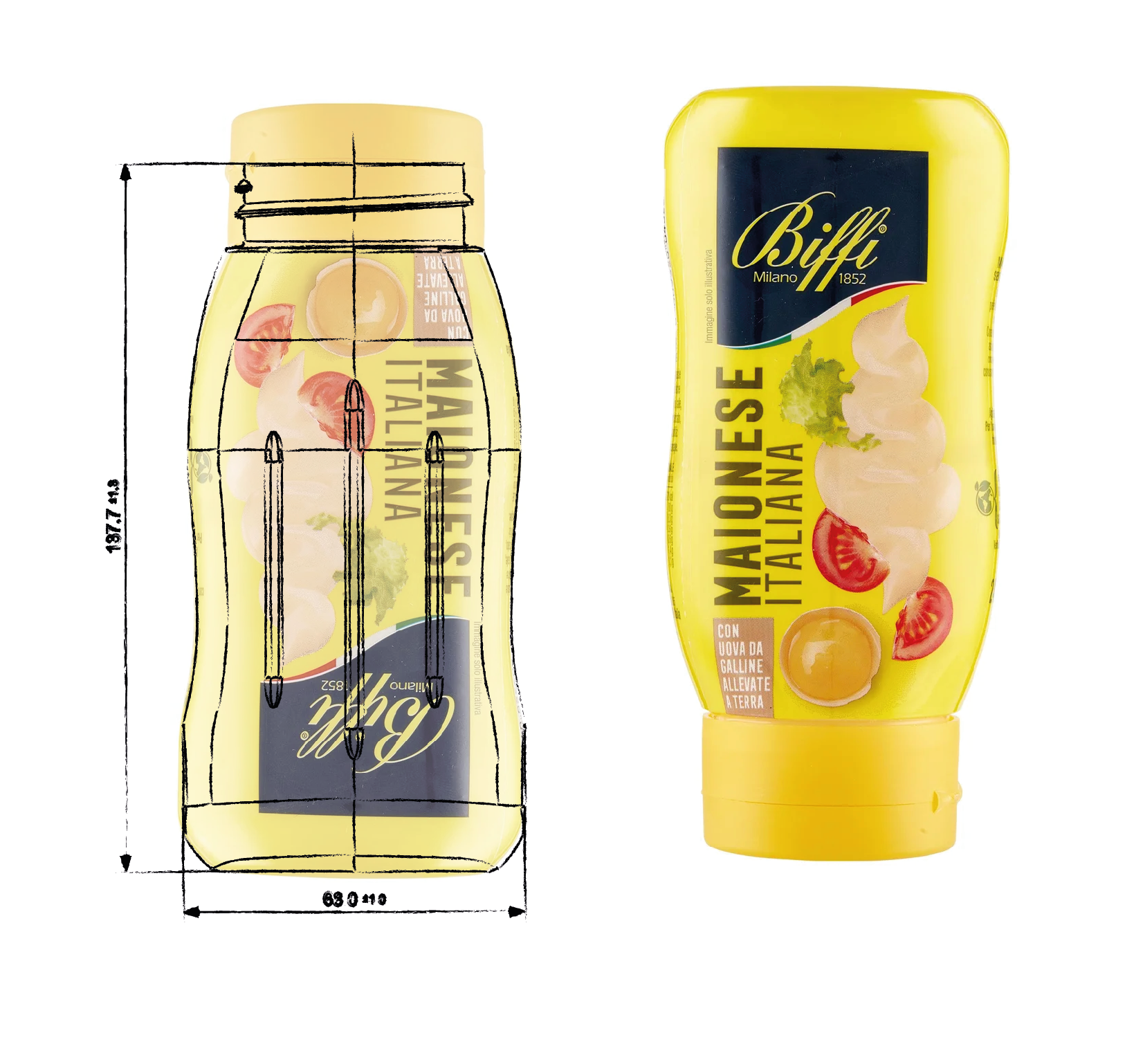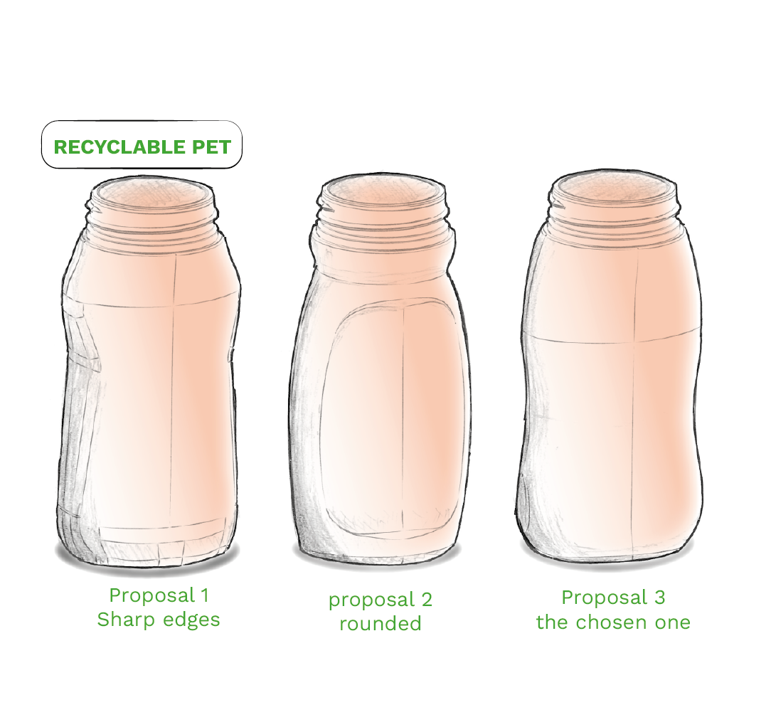 On the occasion of the material switch from non-recyclable multilayer PP to recyclable PET, the client requested a redesign of a dressing bottle. The new container needed to have an attractive shape, ensure optimal squeezability, and maintain a lightweight structure, mantaining the same performances of the current bottle and allowing for shrink sleeve labeling.